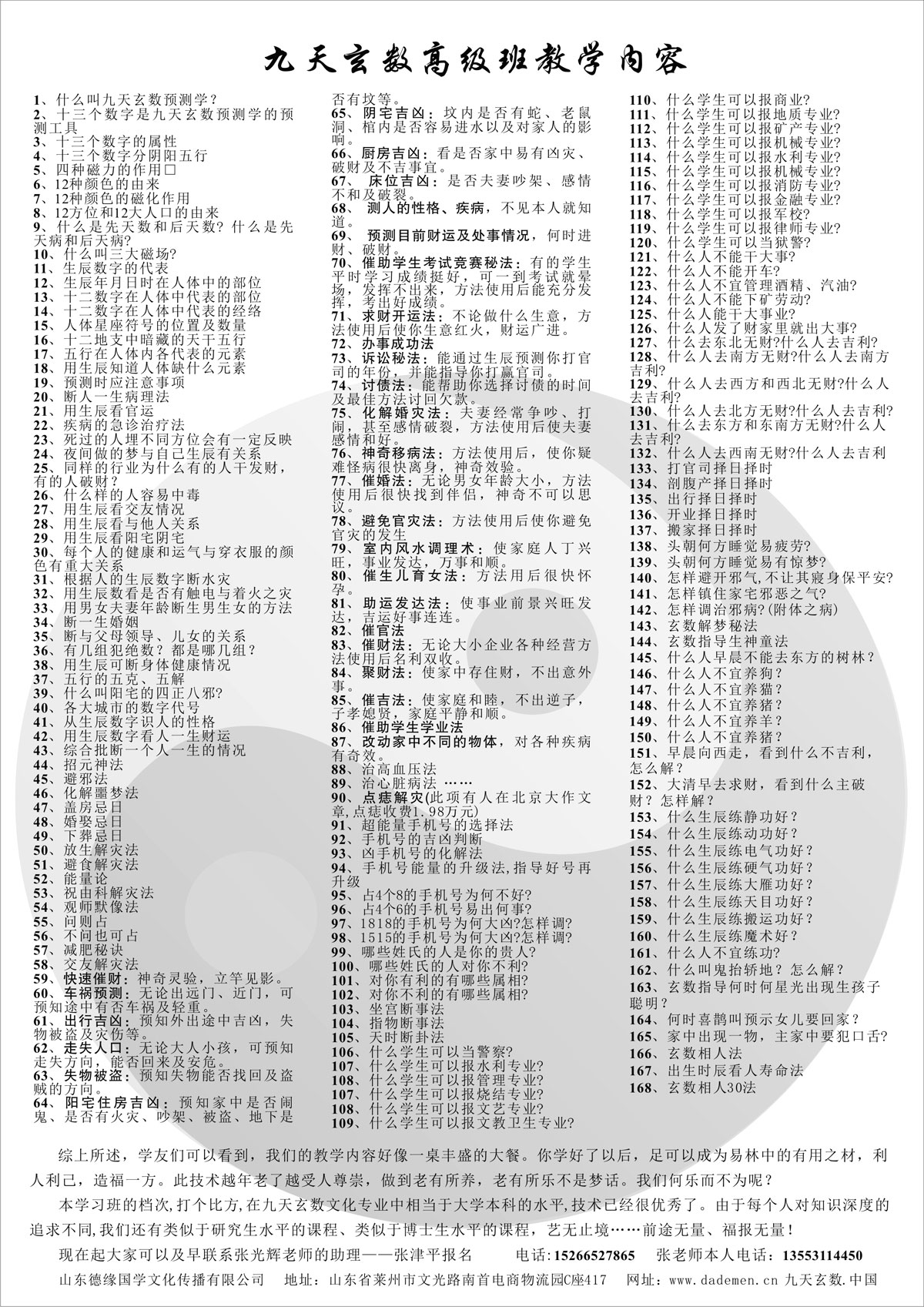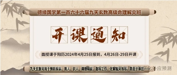 山东德缘国学第166届九天玄数高级命理解灾班的开课时间定于阳历2024年4月25号(农历三月十七日)报到,4月26日上午8点正式开课,29日下午五点结束,共四天。本次面授课全程由张光辉老师的女儿张津平讲课,每天授课时间7个小时,学费5200,资料费300元(自愿选择),为保证教学质量,课程限制人数(教室最多容纳50人),新学员为主。凡是参加此次面授班的新、老学员看到通知后请提前联系张津平报名(报名后除特殊情况不可缺席),谢绝空降,报名截止到4月15日。
